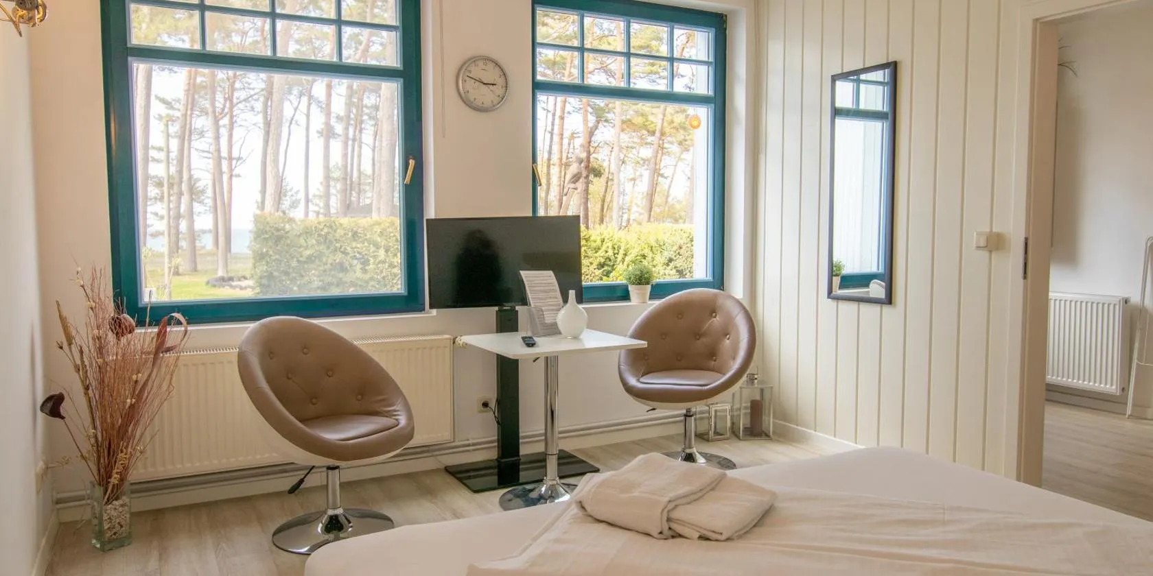 Obiekt Waldhaus am Meer oferuje taras, balkon oraz widok na ogród. Odległość ważnych miejsc od obiektu: Kościół Mariacki w Greifswaldzie – około 20 km.