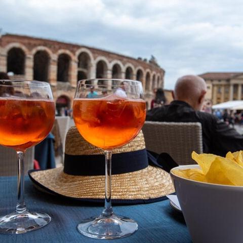 - Občerstvení a nápoje na malebném náměstí Piazza Bra poblíž Arény.