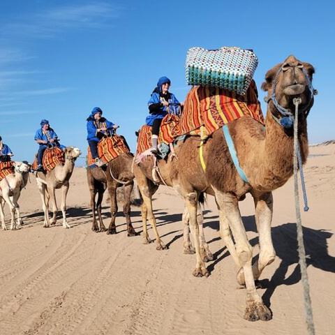 Připojuji se ke svým klientům na místě setkání, které si vyberou, abych je vysadil v blízkosti turistických stezek. Před každou jízdou je organizována instruktáž, aby byli lépe připraveni. K dispozici bude mládě a djellaba, která je ochrání před větrem nebo pískem rozvířeným nohama dromedárů, během kurzu jim bude odhaleno několik informací o tomto věrném společníkovi Muže od noci časů. trvat tři hodiny. Po 1 hodině je naplánována přestávka na piknik na doplnění paliva a vychutnání si tohoto krásného okamžiku v nabídce: (královský čaj + domácí chléb + arganový olej + domácí koláče) .Recover procházka mezi divokými plážemi, lesy, dunami a historickými ruinami. Zpět k účasti na nejkrásnější show: slunce visící na dveřích západu slunce mezi nebem a mořem.