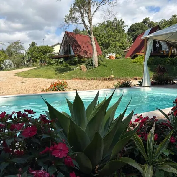 Piscina, churrasqueira, natureza - Brazilian Corner 位於伊比烏納,提供 WiFi(免費),且住宿可享池景,設有室外游泳池、花園和共用休息室。這間住宿享有園景,設有陽台。 這間度假屋設有露台,享有山景,設有 2 間臥室、起居室、電視,廚房設備齊全,且附冰箱和烤箱,以及 2 間附淋浴設施的衛浴。這間度假屋提供毛巾和寢具。