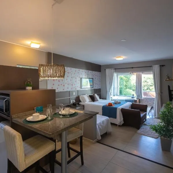Coração do Rosa - Aptos com cozinha, pertinho do centrinho com piscina e Jacuzzi ligger i Praia do Rosa og tilbyder indkvartering med terrasse eller balkon, gratis wi-fi, fladskærms-tv samt en...