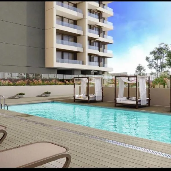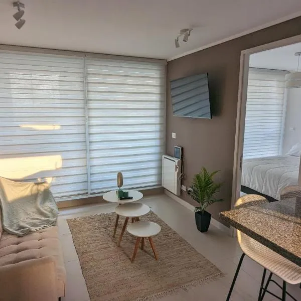 Concón, Edificio Vista Higuerillas, Costa de Montemar, A PASOS DE LA PLAYA位于康康,提供带免费WiFi的花园景客房,配备户外游泳池和露台。这家自助式公寓配有私人泳池、花园和免费私人停车位。 这家1卧室公寓配备带平板电视的起居室、设施齐全的厨房和1间浴室。这家公寓也为客人提供休息区和1间浴室。
