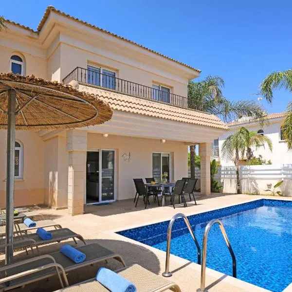 This refined Ayia Napa hotel features a lush palm garden with direct access to the sandy Grecian Bay. Its elegant restaurant offers international cuisine and poolside dining opportunities.