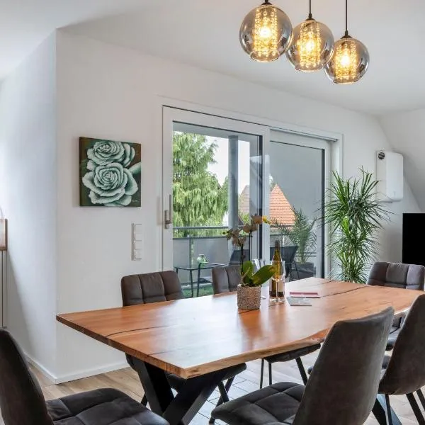 Modernes Loft am Rebberg im historischen Winzerhof位于Ehrenkirchen,配备带免费WiFi的花园景客房,配有季节性室外泳池、花园和露台。内部提供私人停车位。 这家公寓提供1间卧室、1间浴室、床上用品、毛巾、平板电视、用餐区、设施齐全的厨房以及池景庭院。1间浴室提供浴缸或淋浴设施和吹风机。