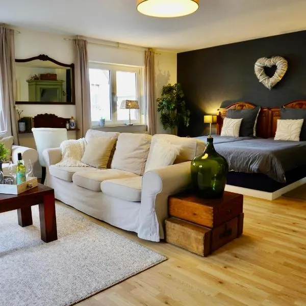 Ferienwohnung Korbmacher - Auszeit in der Pfalz坐落于Heuchelheim-Klingen,距离卡尔斯鲁厄会展中心有36公里,距离巴登州立剧院有37公里,距离卡尔斯鲁厄城堡有38公里。这家公寓配备免费私人停车位、共用厨房和免费WiFi。 这家公寓配有1间卧室、起居室、带冰箱和咖啡机的设施齐全的厨房以及1间带淋浴设施和免费洗浴用品的浴室。