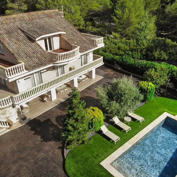 casa rural Mas Pare Sant位于阿尔科伊,配备带免费WiFi的池景客房,配备季节性室外泳池和花园。这家小木屋配有免费私人停车位。客人可以在周边地区体验徒步和乒乓球等活动。 这家小木屋提供8间卧室、5间浴室、床上用品、毛巾、平板电视、用餐区、设施齐全的厨房以及山景露台。这家小木屋也配备休息区以及5间带坐浴盆、淋浴设施和吹风机的浴室。 住宿配备带飞镖的游戏室以及游乐场。
