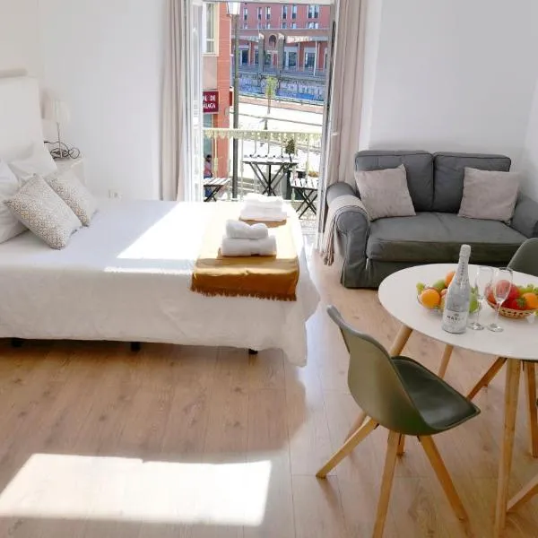 Aptos plaza de los mártires 距離馬拉加中心 500 公尺,提供 WiFi(免費)以及附微波爐、爐子和烤吐司機的廚房。住宿可安排私人停車位,需額外付費。 每個房型都設有私人衛浴和浴缸或淋浴設施、空調、平面電視以及冰箱。