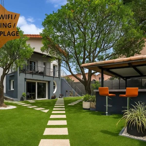 Villa Azur - 2 pièces rez-de-jardin dans une maison avec piscine ligger i Villeneuve-Loubet og har et sesongåpent utendørsbasseng og en terrasse i tillegg til gratis WiFi og utsikt over hagen.