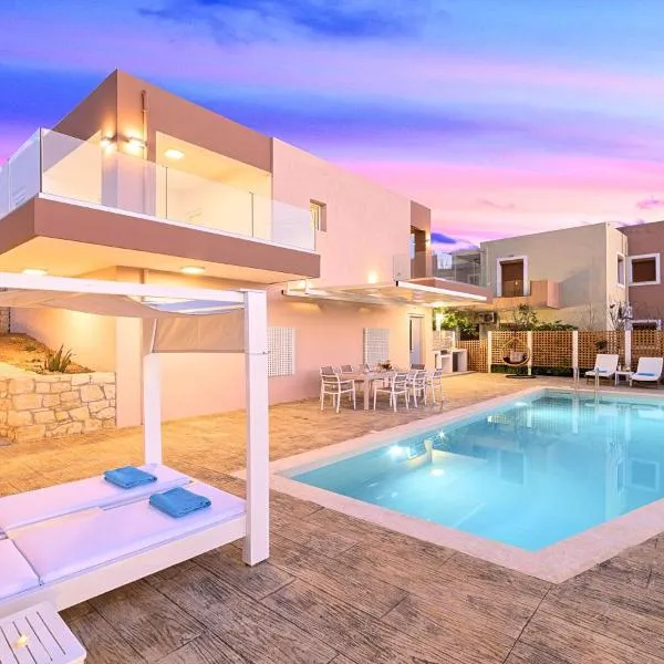 Villa Sugar位于埃皮斯科皮·罗希姆诺,距离埃皮斯科皮海滩(Episkopi Beach)有2.6公里。客人可以使用按季节开放的室外泳池、免费WiFi和礼宾服务。这家自助式别墅配有私人泳池、花园和免费私人停车位。 这家别墅配备4间卧室、3间浴室、床上用品、毛巾、带有线频道的平板电视、用餐区、设施齐全的厨房以及海景露台。这家空调别墅还提供休息区、洗衣机以及3间带吹风机的浴室。