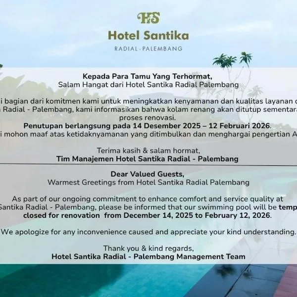 Hotel Santika Radial Palembang ligger i Palembang, 5,2 km från Ampera Bridge, och erbjuder boende med en utomhuspool, gratis privat parkering, ett fitnesscenter och en trädgård.