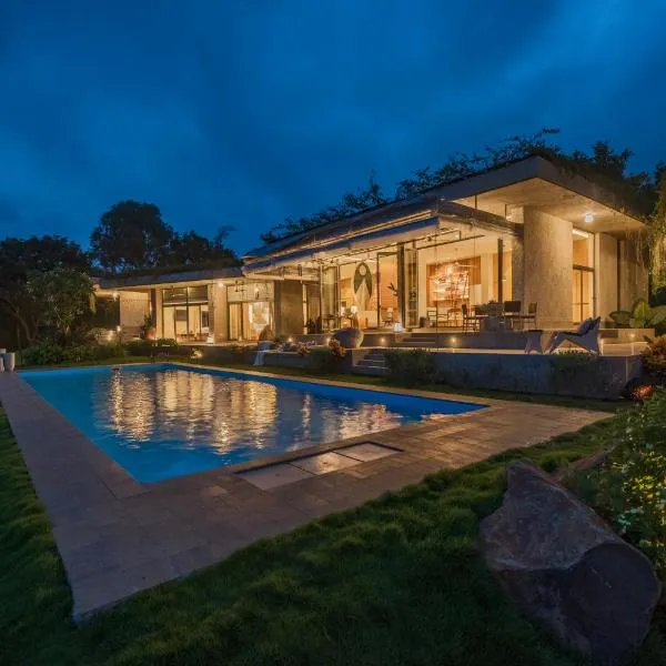 SaffronStays Solasta - 2BR luxury villa with black marble infinity pool, lotus pond & dam views in Mulshi se nachází v destinaci Mulshi a poskytuje venkovní bazén a ubytování s bezplatným Wi-Fi a...