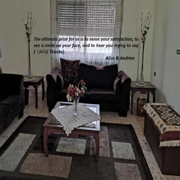 Simple home享有山景,提供露台和阳台,距离尼波山约有17公里。这家住宿距离圣乔治希腊东正教教堂有9公里,配备花园和免费私人停车位。 这家公寓配有1间卧室、1间带坐浴盆和淋浴设施的浴室、休息区以及带冰箱的厨房。1间浴室提供拖鞋。 Simple home距离死海全景建筑群与博物馆有23公里,距离迈因温泉有23公里。阿里亚皇后国际机场距离住宿有30公里。