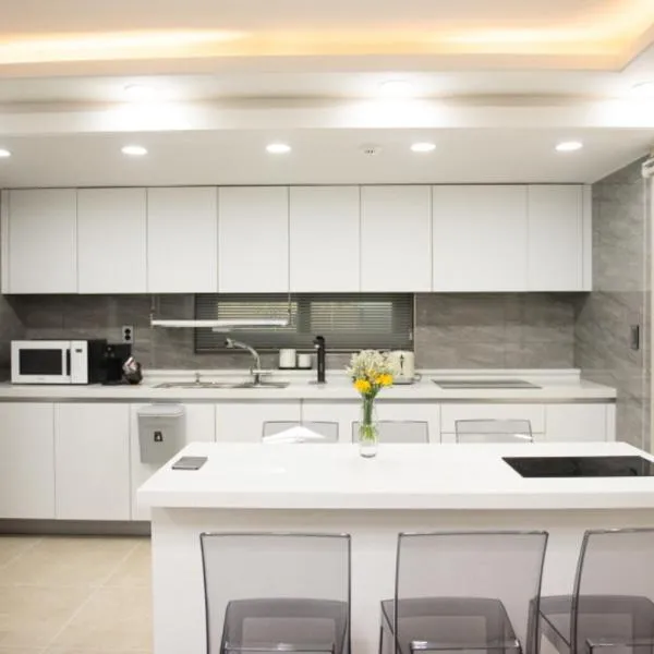 Chandelier Pension位于济州市,距离锦陵海滩(Geumneung Beach)有不到2.8公里,距离雪绿茶博物馆有13公里,提供免费WiFi、空调、季节性室外泳池和花园。内部提供私人停车位。 这家公寓享有海景,提供露台,配有3间卧室、起居室、有线频道平板电视、设施齐全的厨房以及3间带淋浴设施和热水浴池的浴室。3间浴室配有浴缸,也提供免费洗浴用品,提供毛巾和床上用品。
