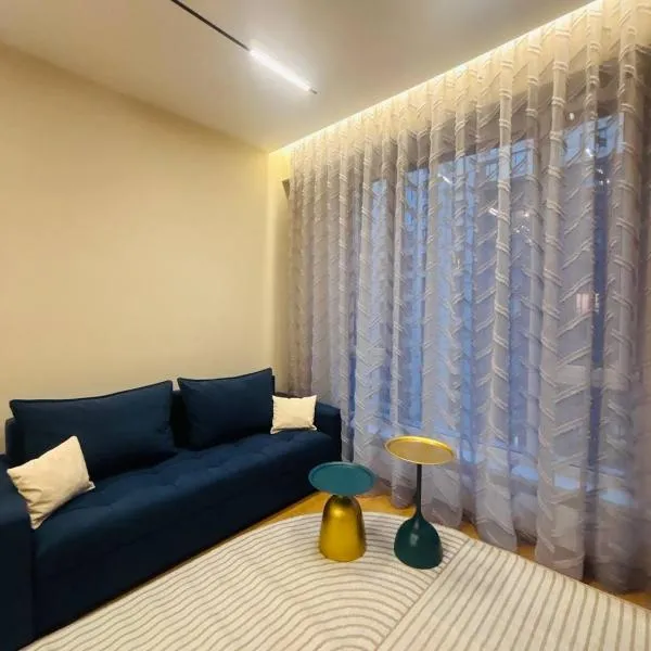 Современный дизайн 2 комнатная центр города ligger i Almaty, 12 minutters gang fra Ascension Cathedral og 1,2 km fra Gvardeytsev-Panfilovtsev Park. Her er gratis wi-fi og et fladskærms-tv.