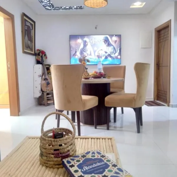 Beralmar Asilah Chez FATIMA位于艾西拉,距离艾西拉海滩(Plage de Asilah)仅有2分钟步行路程,提供海滨住宿、户外游泳池、花园、私家海滩和免费WiFi。这家住宿距离丹吉尔大球场有35公里,配备露台和免费私人停车位。 这家公寓配备DVD播放机,提供带冰箱、烤箱和微波炉的厨房、带休息区和用餐区的起居室、2间卧室以及2间带坐浴盆和淋浴设施的浴室。