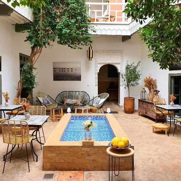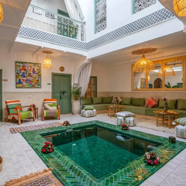 Riad Dar Dialkoum旅馆位于马拉喀什(Marrakech),提供仅限成人入住的住宿,设有餐厅、室外游泳池和共用休息室。旅馆提供客房服务、礼宾服务以及覆盖各处的免费WiFi。旅馆提供天井。 典雅的客房均以色彩缤纷的织物和木雕装饰,享有庭院的景致。每间空调客房均可应要求提供带浴袍、免费洗浴用品和吹风机的私人浴室。 Riad Dar Dialkoum旅馆提供欧陆式或单点早餐。