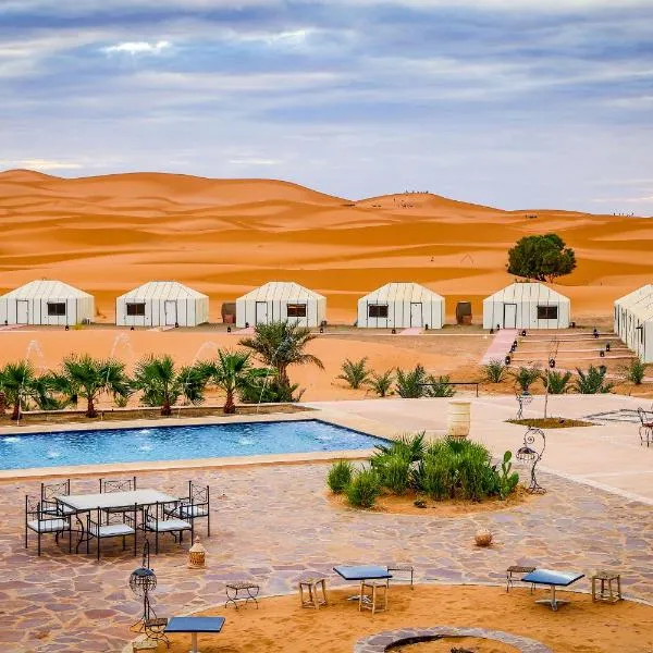 Die Unterkunft The White Camp Merzouga - Official Luxury Desert Camp & Camel Tours befindet sich in Merzouga und bietet kostenloses WLAN. Gäste genießen einen Garten, eine Terrasse und ein Restaurant.