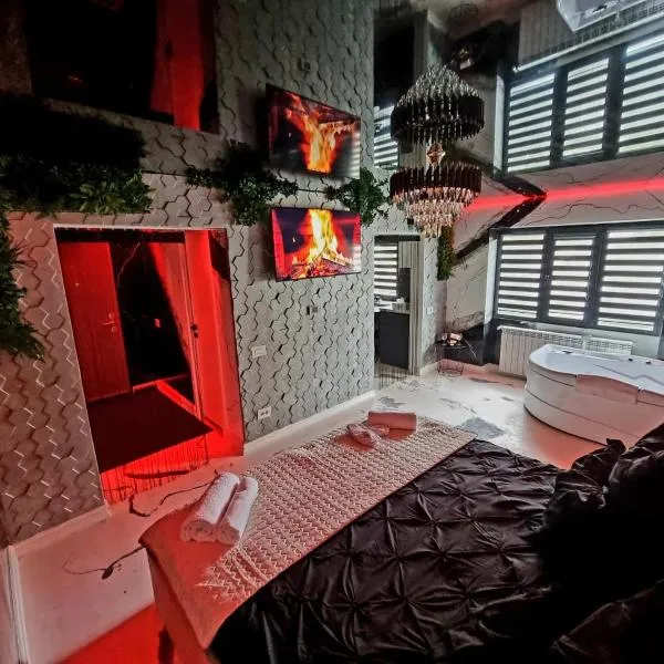 All In Jacuzzi Apartment坐落于彼得罗沙尼,提供带阳台和免费WiFi的自助式住宿。 这家空调公寓配有1间卧室、起居室、带冰箱和电热水壶的设施齐全的厨房以及1间带淋浴设施和热水浴池的浴室。这家公寓还配备平板电视以及1间带免费洗浴用品的浴室。 这家公寓提供热水浴池。 克拉约瓦国际机场距离住宿有168公里。