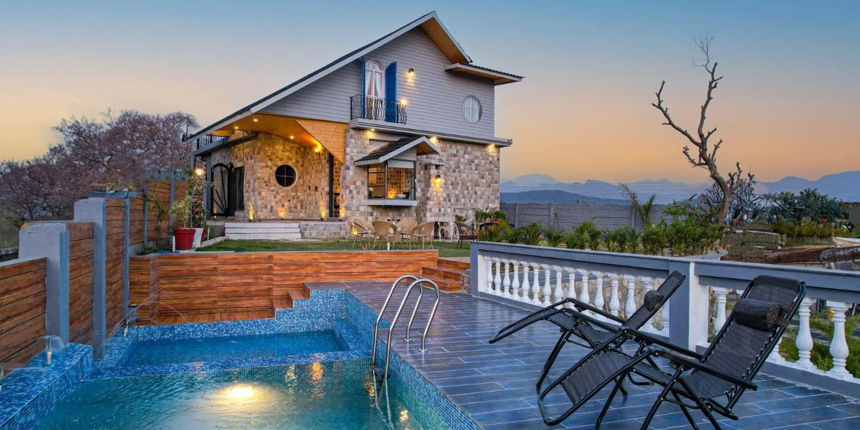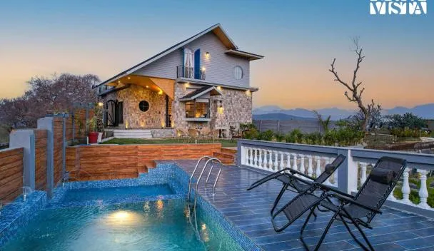 Mit einem Garten und Bergblick, ist die Unterkunft SaffronStays Timber Quest - Pinewood villa with jacuzzi rooms, decks, BBQ & forest views in Dehradun gelegen in Dehradun, 44 km von Mansa Devi Tempel...