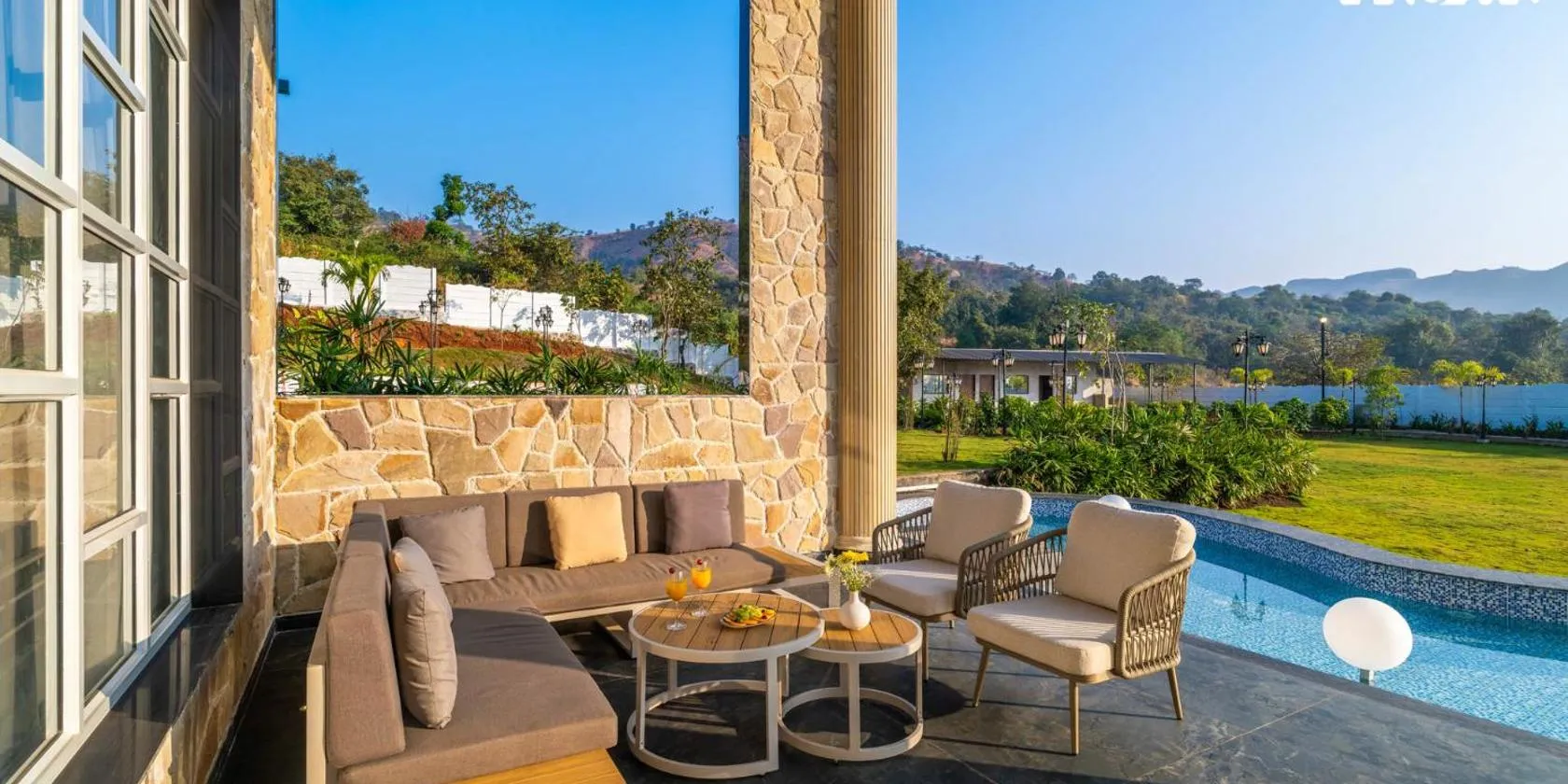Karjat - 3 BHK Private Bungalow with Private Pool & Garden ligger i Karjat med bjergudsigt. Her er en udendørs swimmingpool, en have og en terrasse. Der er også gratis wi-fi.