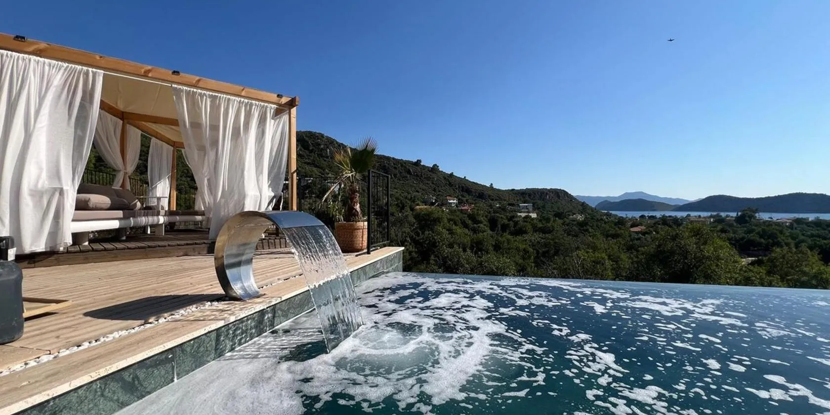 Villa with Hot Pool in Marmaris se află la aproximativ 17 minute de mers pe jos de Plaja Hisaronü Koyu și oferă vedere la munte, o piscină în aer liber, o terasă și facilități pentru sporturi acvatice...