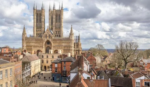 The Old Palace Lodge sits in the shadow of Lincoln Cathedral. It blends traditional features with modern amenities like flat-screen TVs.