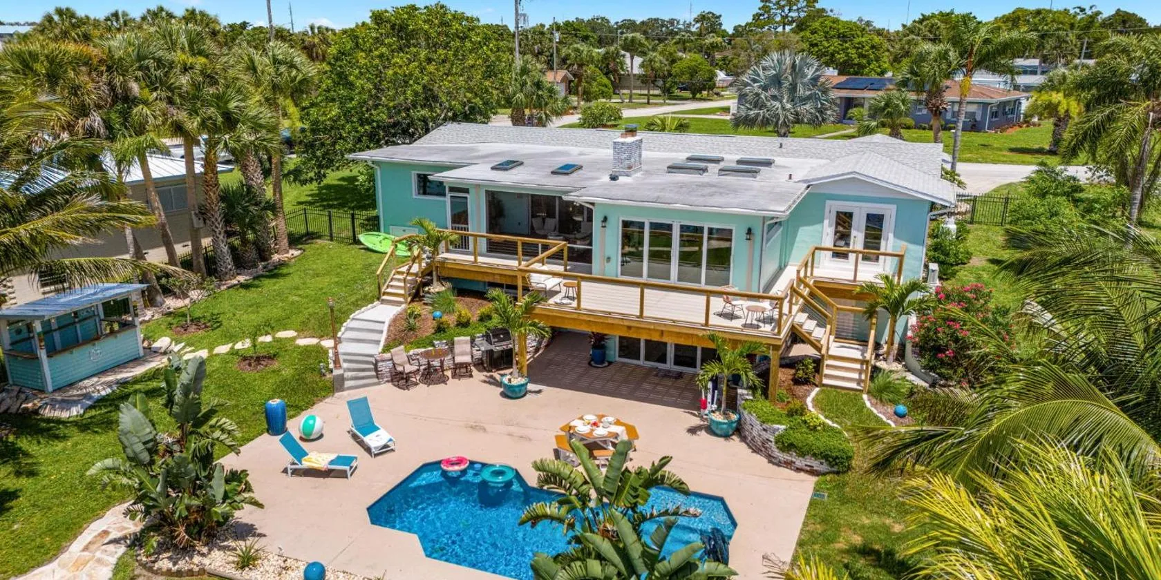 庭の景色を望むRelaxing 2Br 1Bath Oasis near River 9 min to Beachはテラスとパティオを提供する宿泊施設で、ブレバード芸術科学博物館まで約8.6kmです。ウミガメ保護協会メルボルンビーチから5.5kmの場所にあるエアコン付きの宿泊施設で、無料WiFiと敷地内の専用駐車場を提供しています。