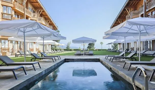 Com piscina ao ar livre, jardim e restaurante, Pirin Golf Hotel&Spa Apartment 17 - private luxury apartment fornece acomodação em Razlog com Wi-Fi grátis e vista para a montanha.