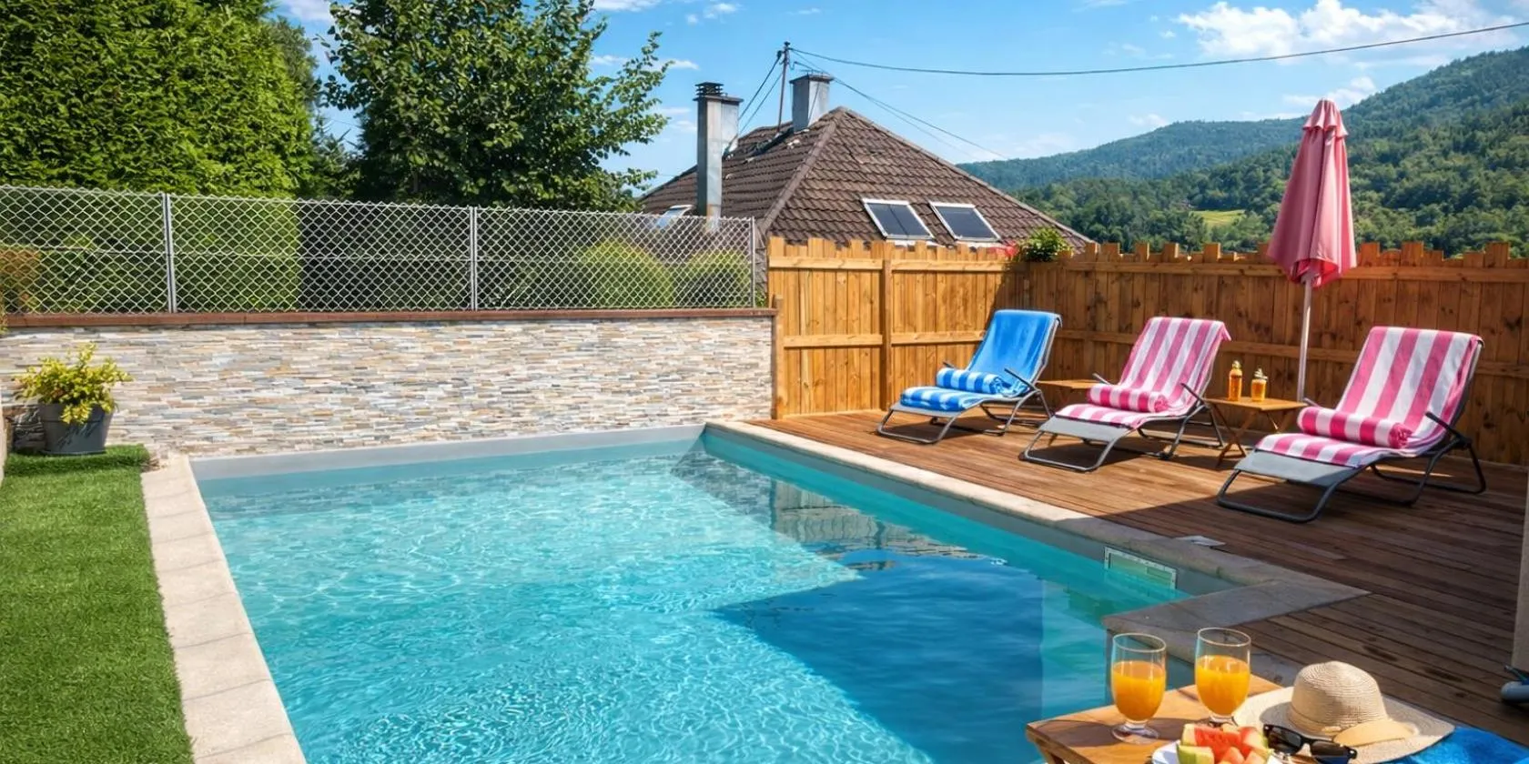 GÎTE AVEC PISCINE CHEZ Véro se nachází v destinaci Breitenbach-Haut-Rhin a nabízí sezónní venkovní bazén, zahradu, vybavení pro grilování a ubytování s bezplatným Wi-Fi a výhledem na bazén.