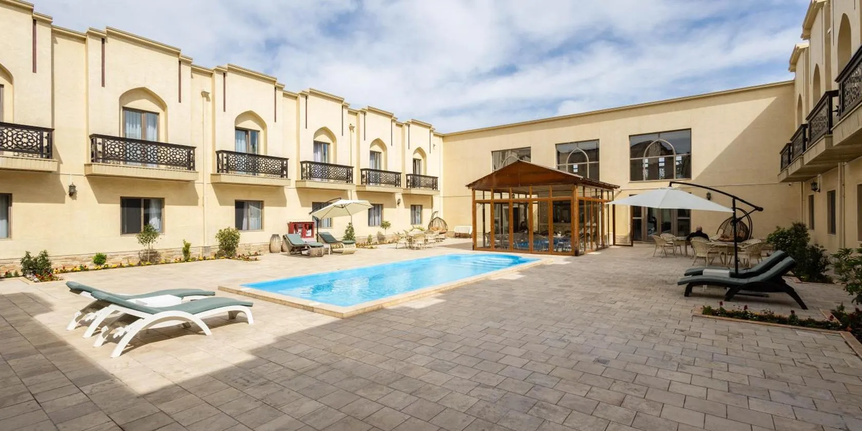 GUEST HOUSE "Rohat Lux" mempunyai kolam renang outdoor musiman, taman, lounge bersama, dan teras di Samarkand.