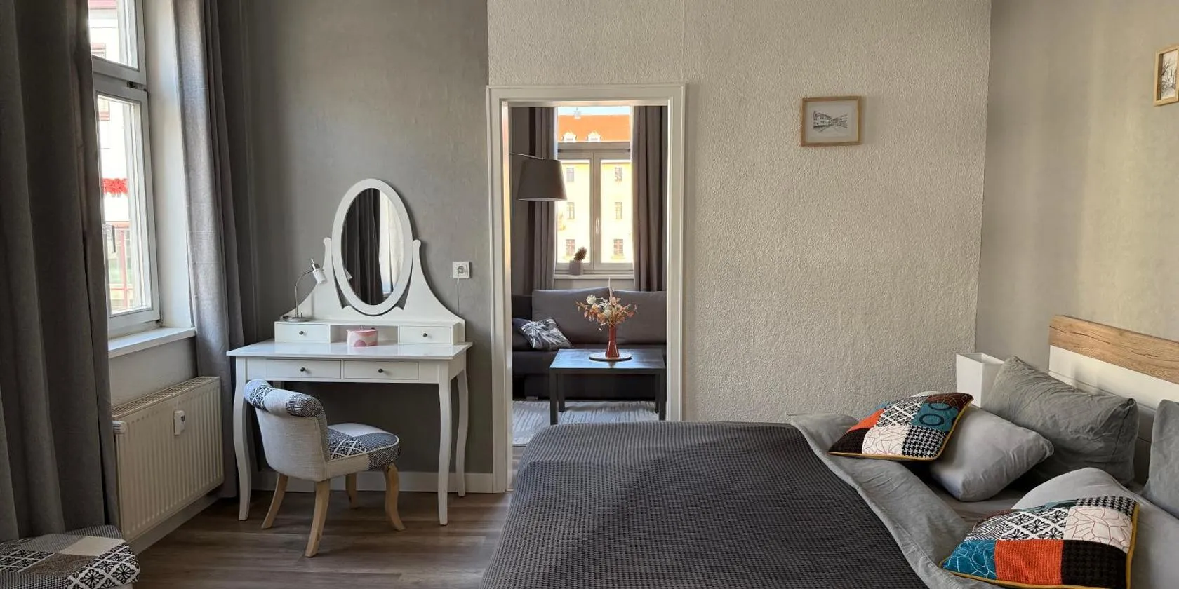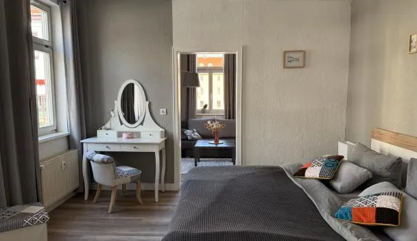 Gelegen in Erfurt, 800 m von Hauptbahnhof Erfurt und 4,6 km von Messe Erfurt, bietet die Unterkunft Helle 72qm Maisonette Altbau Wohnung im Herzen Erfurts mit Kingsize Bett, 45 Zoll Smart-TV, Nobilia...